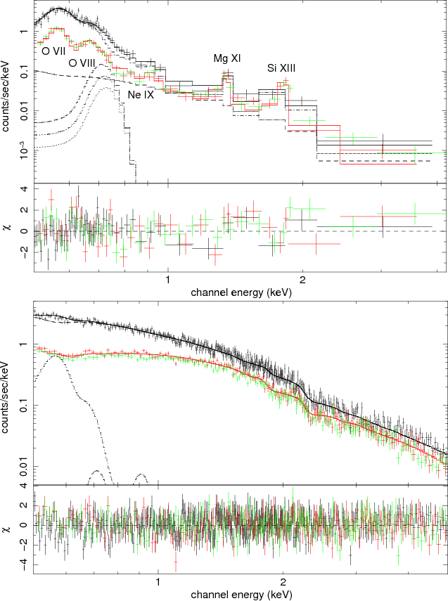 Figure 2: Upper panel: pn spectrum ( upper, in black) and MOS1, 2 ( lower, in red and green) spectra of region 29 of Fig. 1 with the corresponding best-fit model and residuals. The best-fit thermal+non-thermal model described in Sect. 3.1 is shown as a continuous line, while individuals components are shown as dashed black lines for the pn spectrum only. Relevant emission lines are also indicated. Lower panel: same as upper panel for region 23. |