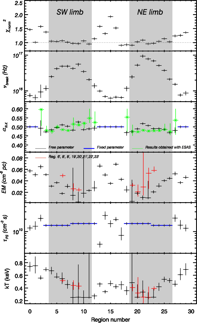 The determination of the chemical abundances is complicated by the combined presence of thermal and non-thermal continuum. We focus only on the elements whose line complexes are visible in the spectra of the ``thermal'' regions (i.e., O, Ne, Mg, and Si, see upper panel of Fig. 2), but we find that, even in thermal regions, the abundances are not well constrained. Although the relative ratios of O, Ne, Mg, and Si abundances are quite well determined in each thermal region, their absolute best-fit values are entangled with the normalization of the VPSHOCK component. In particular, for a given set of best-fit abundances, we obtain similar