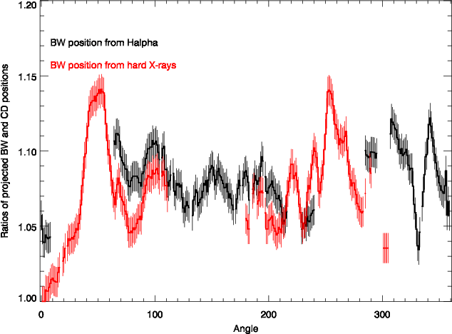 of radii between the blast wave shock front (BW) and the contact discontinuity (CD) in several points, finding very low values with a minimum of