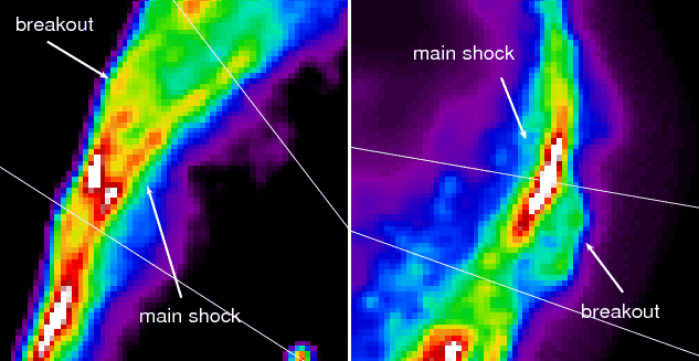 to be lower than that derived from simple 1D hydrodynamic models. We conclude that the shock is modified everywhere and that the aspect angle differs significantly from