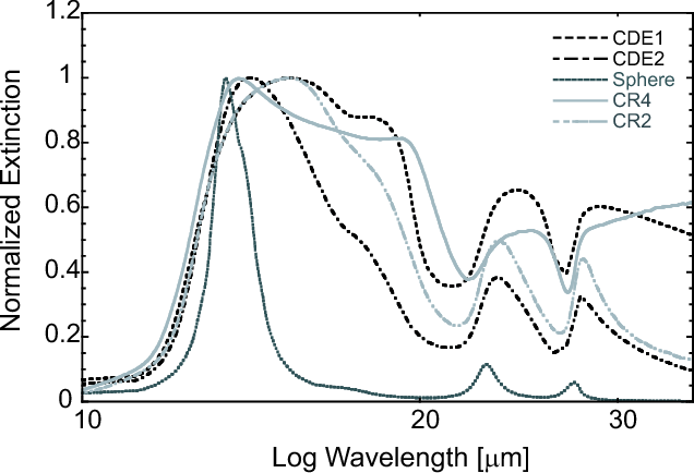 Experimentally measured spectra and theoretical calculations which assume simple geometrical models such as spherical (Mie 1908) or ellipsoidal (Bohren & Huffman 1983) grain shapes have been generally applied to compare models with observed spectra. It has recently become possible to utilize specific methods for particularly inhomogeneous structures and arbitrarily shaped particles for absorption, scattering and extinction calculations (e.g. Min et al. 2005; Mishchenko 1990; Purcell & Pennypacker 1973; Drain 1988; Mackowski & Mishchenko 1996). However, predictions based on these calculations are uncertain since, in reality, grain shape might be tremendously irregular and complex.