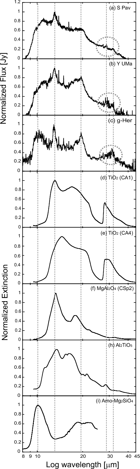 Based upon a model calculation of O-rich circumstellar dust shells around pulsating AGB stars, Jeong et al. (1999) stated that TiO2 would be the most promising candidate as the nucleation seed for further heterogeneous grain growth instead of Al2O3. Until now, the presence of TiO2 dust grains in spectra of AGB stars has not been confirmed; however, they were identified in meteorites such as carbonaceous chondrites (Greshake et al. 1996,1998) and the Krymka unequilibrated ordinary chondrites (Nittler et al. 2005). Presolar titanium oxide in unequilibrated ordinary chondrite meteorites has been reported (Nittler et al. 2008). Greshake et al. (1996) suggested that these oxides did not undergo further chemical reactions with remaining nebular gas during the formation of different oxide or silicate dust grains. According to elemental abundances in meteorites (Cameron 1973), magnesium (Mg), silicon (Si), and iron (Fe) are more abundant than aluminum (Al) and calcium (Ca) by a factor of 12. Titanium (Ti) is a much less abundant metal; it is a factor of 400 times less abundant than Si. Thus Mg-, Si-, Fe-, Al-, and Ca-compounds surpass Ti-compounds in quantity.