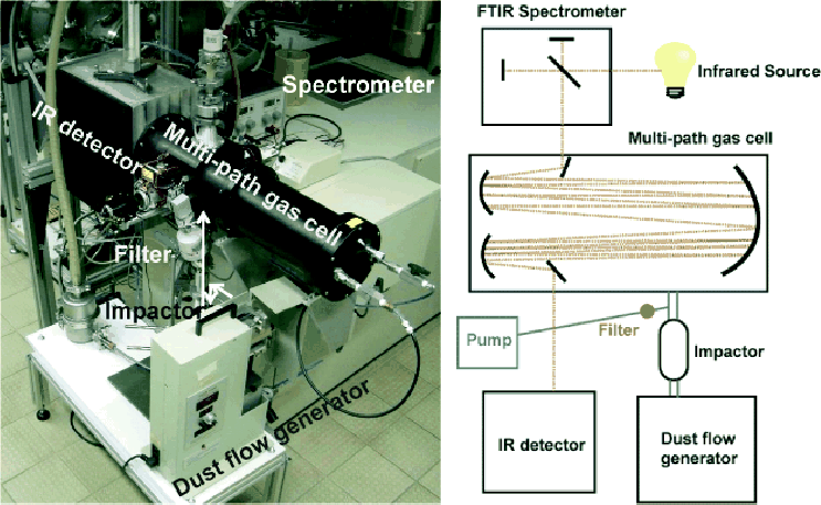 Since a Fourier Transformation Infrared Spectrometer (FTIR, Bruker 113v) with a DTGS detector with CsI windows is fixed to the cell, it is possible to measure the extinction spectrum of the suspended dust particles in N2 gas. As a consequence, we avoid any environmental effect during the aerosol measurement, and the measurement conditions are closer to a vacuum with regard to the dielectric function of the medium (N2: