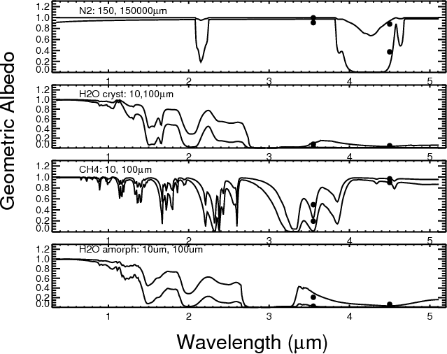 Table 4 compares the best model (incorporating 20% N2), to a model with 10% and no N2 respectively to show how changing the amount of N2 affects the other components. The first row shows the rms error of each model when compared to the data. The following two rows show the amount of the materials specified mixed as inclusions in CH4, the third line the amount mixed as inclusions in crystalline H2O ice. Their grain size is not listed as in this kind of