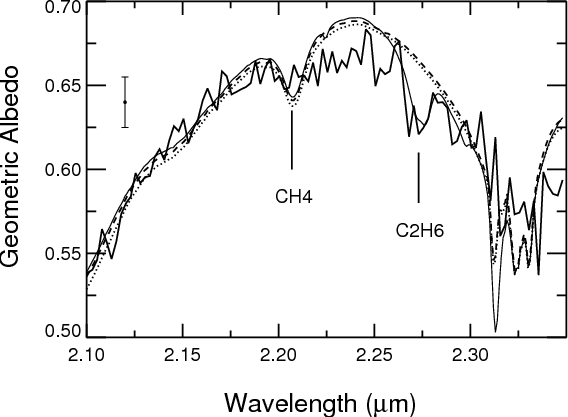 More recent observations by Schaller & Brown (2007b) with the Keck telescope confirmed the presence of a weak band at 2.2 m, but it was instead assigned to CH4 ice, as CH4 also fits stronger absorption bands at longer wavelengths (around 2.32 and 2.38