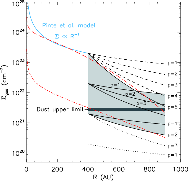 - Outside 400 AU, the surface densities of the molecular gas, as