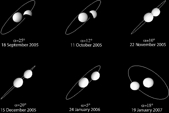 and the two coordinates of the rotation pole. In our model, the orbital plane was considered to be merged with the equatorial plane of either component. The spin vector was derived from an iterative procedure based on the estimation of the epoch corresponding to a nearly perfect edge-on aspect of the system. This method was described carefuly in Descamps et al. (2007b). In the present case, we initially guessed that this epoch was around September-December 2005, given the high magnitude drops recorded in the lightcurves during this period of time. From this condition, we derived an admissible set of pole solutions (Fig. 9). The most suitable was the one minimizing