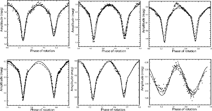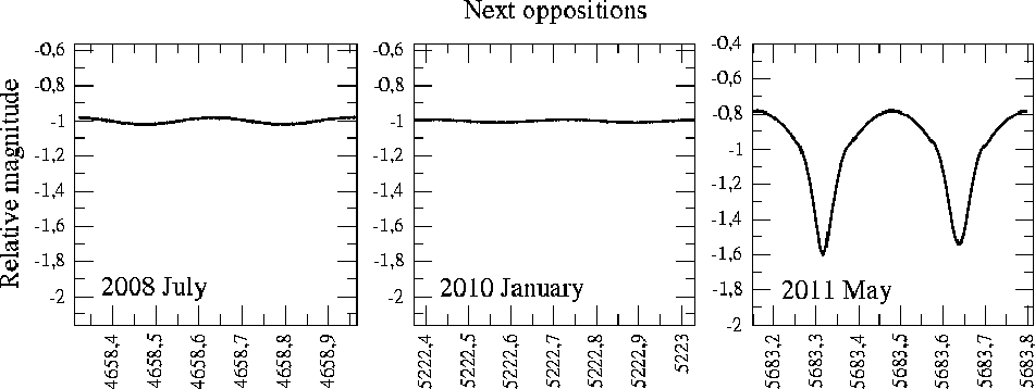 Observing geometries and dates for the forthcoming oppositions of Lundia are listed in Table 4. Both models are capable of predicting lightcurves in future oppositions, examples being presented in Fig. 11. In July 2008 and January 2010, we expect to observe close to pole-on orientations of the Lundia system and measure lightcurves without eclipses/occultation events. Partial lightcurves obtained in May 2008 (during revision of this manuscript) were of small amplitude of about 0.2 mag., despite a 24 deg phase angle, and are compatible with the obtained pole solution.