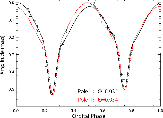 The synthetic lightcurves produced by the two solutions were superimposed on the observations in Fig. 10. Overall, the modified Roche solution provides the best-fit solution of the lightcurves in the sense of minimization of the goodness-of-fit criterion ,