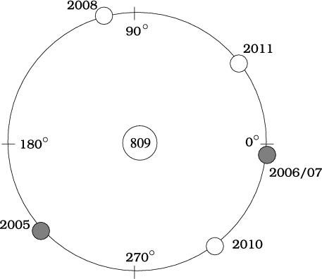 Apparent aspect of the double system 809 Lundia at the times of observations. The orbit of the secondary, considered to be smaller component is shown. Phase ( |