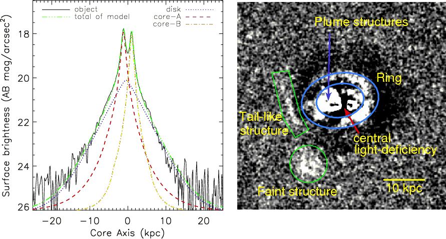 The left panel of Fig. 2 illustrates the results of the morphological decomposition. We show the light profile along the core axis which is defined to be the line across the centers of the two bulges. The profile of each seeing-convolved model component as well as the sum of them are plotted separately in Fig. 2 with different symbols. The light profile at |r|>5 kpc is close to a straight line, which is strongly indicative of the existence and the significance of the disk. The center of the disk is found to be located between the two nuclei (close to core-A), and no significant structures, e.g., arms, are found in the disk. Note that in the residual maps of all the bands, we find several structures (see V-band for example, the right panel in Fig. 2), including a shell-like structure following the blue ring, plume-like structures that are associated with core-A, a tail-like structure and a faint structures. These residuals indicate a recent galactic interaction in the object.