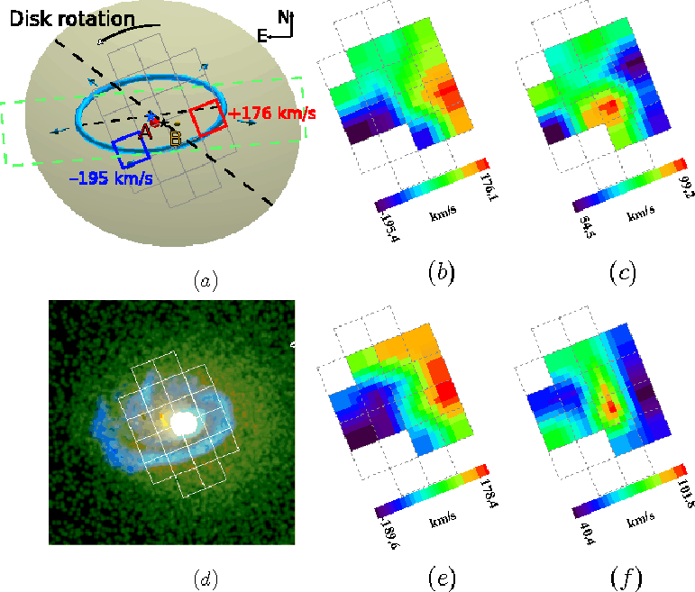 the two bulges represents the center of the disk. The blue star (white star if in a black-white version) above the core-A indicates the center of the ring. The rotated grid in gray dotted lines indicates the G IRAFFE IFU elements (see panels b) and c)). The red and the blue