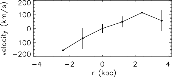 50 km s-1. Note that by measuring the absorption lines we are actually measuring the mean velocity of the two bright bulges when considering seeing effects. Using the simulation, we mimicked the slit observation and measured the mean velocity of star particles and of gas particles, respectively. We find a velocity difference of 270
