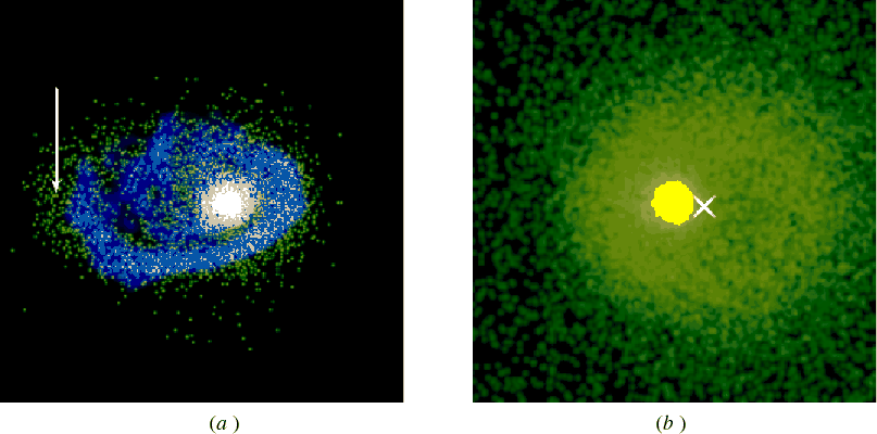 Figure 5: Panel a), the simulated image for the intruder only, with gas superposed in blue. The arrow indicates the star distribution possibly corresponding to the observed tail-like structure. Panel b), the simulated image for the main galaxy only. A weak but broad ring can be recognized. Due to the superposition of the bulge, the left part of the ring shape is hidden. The cross indicates the center of the disk. See Sect. 4.2 for more details. |
