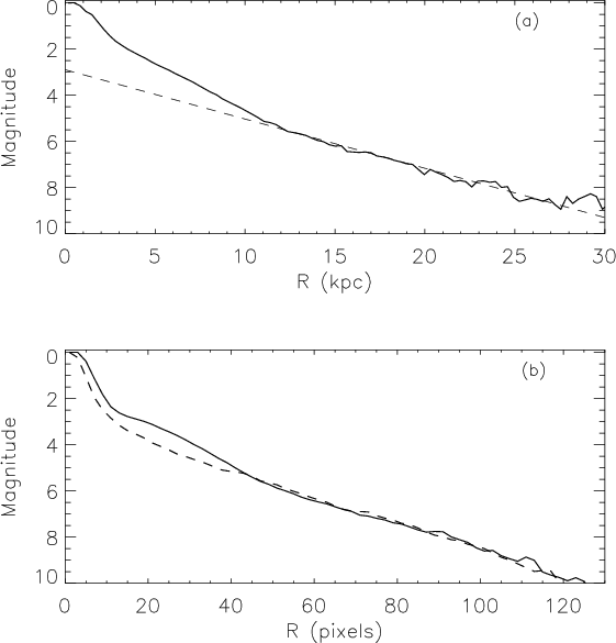 Figure 6: Panel a), the observed radial profile (solid line). The dashed line indicates the slope of the thin-disk component. At the radii from 5 to 10 kpc, we clearly have a thick-disk component which corresponds to the ring that has been formed in the disk of main galaxy. Panel b), the radial profile derived from the simulation. Clearly we have a thin- and a thick-disk component. The appearance of the thick-disk component is related to the formation of the ring. For comparison, the radial profile of the main progenitor is plotted with a dashed line. |