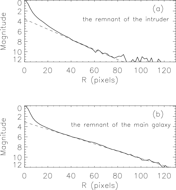 Figure 7: The radial profiles of the remnants in the unbound case, panel a) for the remnant of the intruder, b) for the remnant of the main galaxy. The dashed lines in both figures indicate the disk components. Clearly, the remnant of the main progenitor is dominated by the disk. |