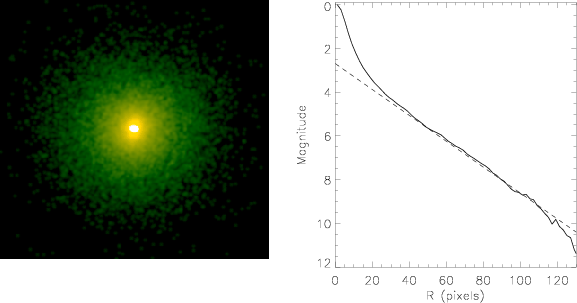 Figure 8: Left: the face-on view of the merger remnants. The image has a size of 103 kpc. Right: the radial profile of the merger remnant. The disk component is indicated by a dashed line. |