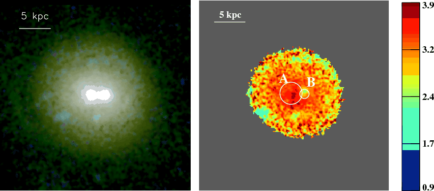 Figure 1: Left: the three-color image composed from the B, V, z bands. The image has a size of 30 kpc. Right: B-z color map of the object. The regions with a signal-to-noise ratio greater than 3 are shown. The circles A, B indicate core-A and core-B, respectively. The radii of the two circles are equivalent to the effective radii of the two cores. These two panels have identical scale and orientation. |