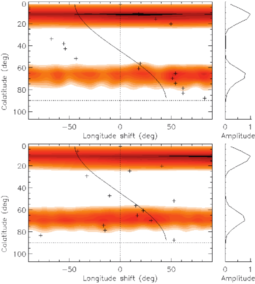 Figure B.1 (upper panel) shows the cross-correlation map comparing the Doppler images of Fig. 7, i.e. the reconstructions for nights 1-4 and 9-12 using line 6122 and rigid rotation. For each co-latitude the map shows the cross-correlation, normalized to the overall maximum, obtained when shifting the spots of map 9-12 by the given longitude angle. Darker orange shades indicate larger correlation values. Crosses mark the correlation maximum for each co-latitude; their values are shown in the right-hand graph, also illustrating the assignment of orange hues. For comparison, the smooth, sine-like curve shows the surface shear resulting from Marsden et al.'s differential rotation law.