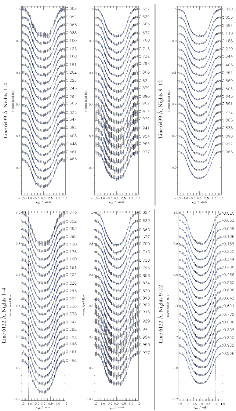 Figure C.1: Stack plot of all DI line profile reconstructions. The left column shows the 39 phases of nights 1-4, the right column the 19 phases of the nights 9-12 observations. The two upper panels show line 6439 Å, the two lower panels show 6122 Å. See Appendix C for more details. |