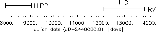 Figure 1: Time coverage of observations used in this paper. HIPP represents the Hipparcos, DI the Doppler imaging, and RV the radial velocity data sets. |