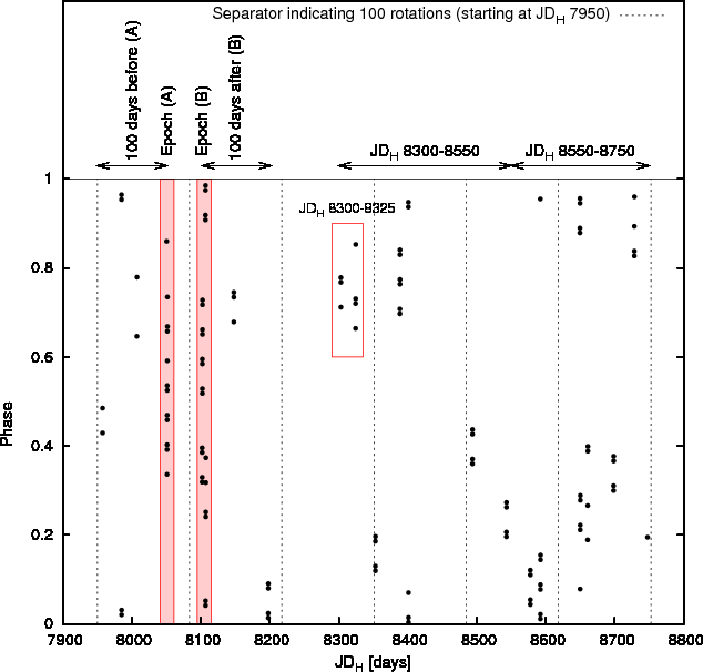 Figure 2: Time vs. phase diagram (period = 1.3371 days) for the Hipparcos measurements (represented by points). Periods covering 100 rotations are indicated by vertical, dotted lines. Time and phase intervals of special interest are marked by arrows and boxes; see text for more details. |
