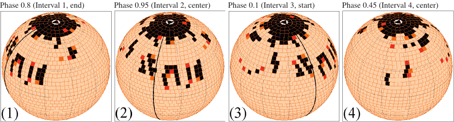 Note that each individual longitude interval produces the same lightcurve profile (normalized by its intensity, i.e. spot coverage), phase shifted according to its position on the surface. The resulting lightcurve is a linear superposition of the individual contributions. When we use a relatively low number of longitude intervals (say 10), it is obvious that the contributions are linearly independent (given a non pole-on view), and the superposition is uniquely defined. Working with real data, measurement errors and phase coverage limit the uniqueness of the reconstruction; nevertheless, with a low number of longitude intervals, only neighboring intervals show considerable dependence.