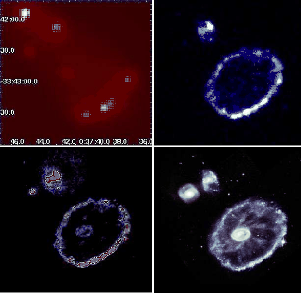 Figure 1: The Cartwheel group in: X-rays - XMM-Newton - EPIC-MOS ( top left). The bright X-ray source in the top left corner is probably a background source; UV - XMM-Newton - OM (UVM2 filter; top right); optical - XMM-Newton - OM (U filter; bottom left); optical - Hubble Space Telescope ( bottom right). The Cartwheel and galaxies G1 and G2 are visible, while galaxy G3 is outside the area shown. |