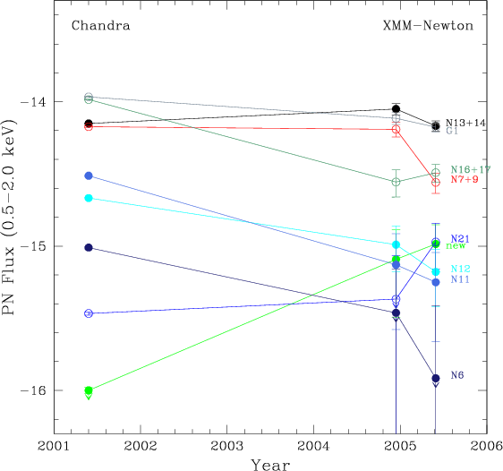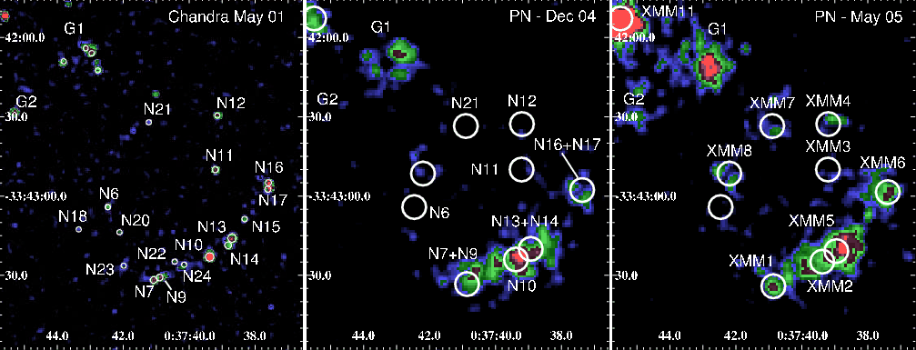 The datasets from the two different epochs were both analyzed independently to study the spectra and the variability of point sources, and summed together to improve the statistics for fainter sources and low surface brightness extended emission. For the spectral analysis, we used the EPIC-pn dataset. MOS1 and MOS2 were used only when EPIC-pn data were unavailable.