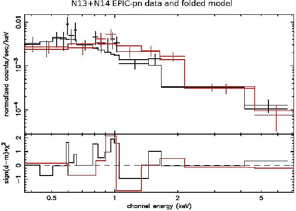 EPIC-MOS and EPIC-pn respectively. The final net exposure times were 29/24 ks in the first observation and 50/42 ks in the second one (MOS/pn respectively) corresponding to