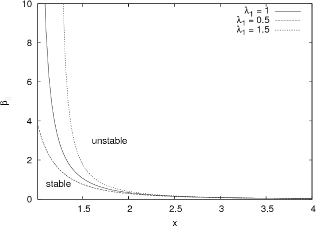 This expression allows us to estimate, as a function of the compression ratio x (other than the upstream parameters), whether the firehose instability emerges or not. First, we see that, for