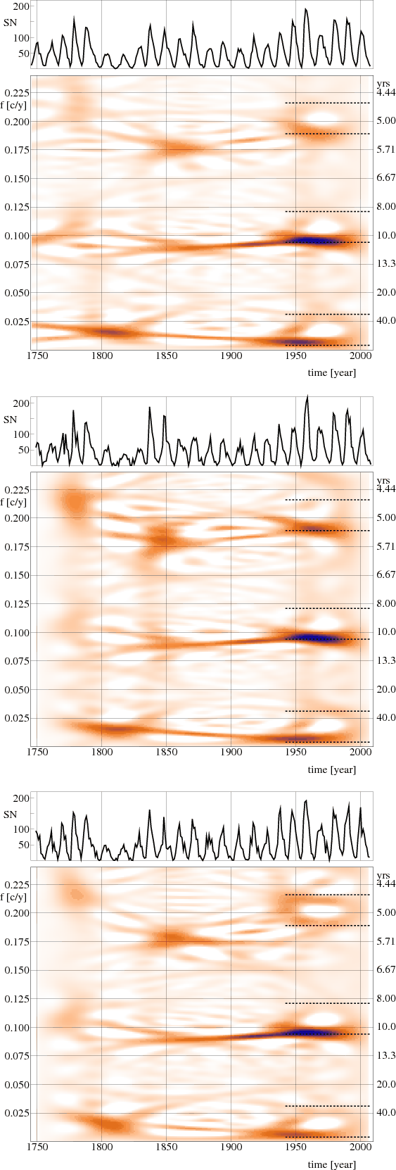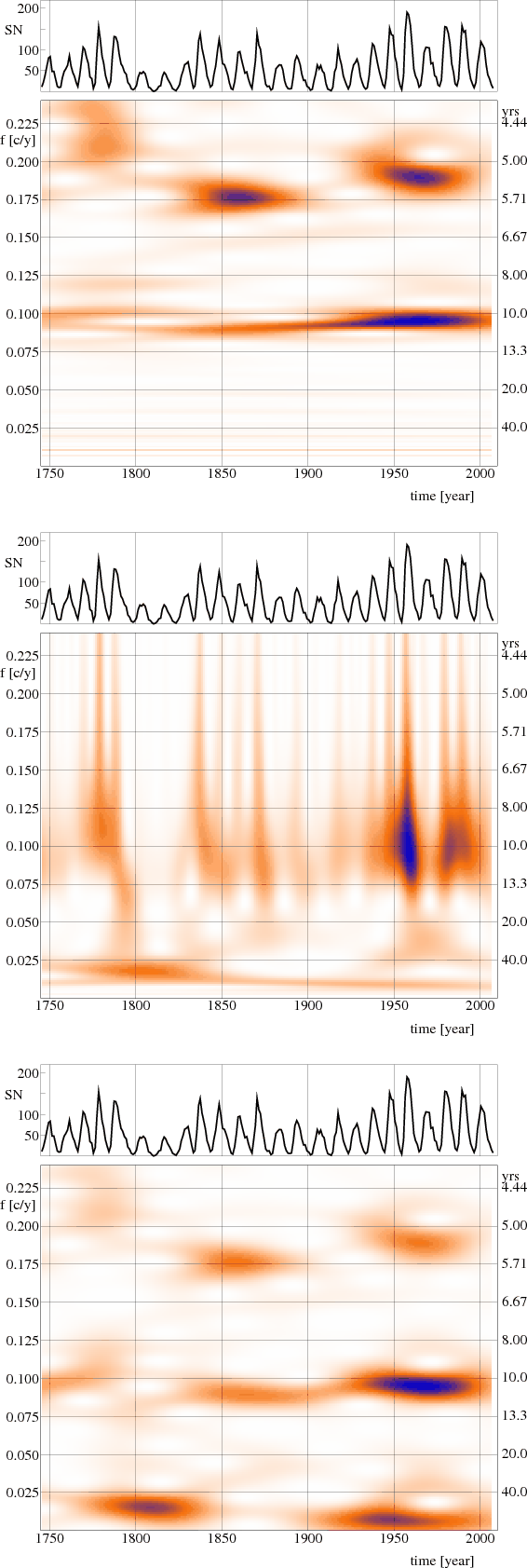 It is well known that the sunspot number is not the best physical indicator of solar activity; however, it is the only direct measure we have for a relatively long time span. Moreover, the sunspot number has an intrinsic fluctuation because of the arbitrariness of the number of visible spots and groups. If we assume that the averages of e.g. the January data are of independent measures those of the July data (i.e., the ``noise'' for the averages of a given month are mostly independent from that of the month half a year before and after), then it is possible to construct two independent datasets: one for the January and one for the July data. The comparison of the results for the two sets gives an idea of the errors in the time-frequency distributions. Figure 6 (middle and bottom panels) exhibits the time-frequency distributions for periods longer than 2.5-yr for both data subsets. The PWD of the two subsets of the data is hardly distinguishable for periods longer than 4 years.