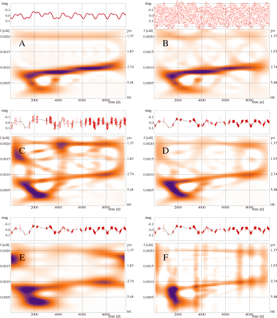 Because of the averaging and spline interpolation, the effect of observational noise is mixed with the effects of sampling, so we performed our tests with ill-sampled data. The resulting time-frequency distributions obtained from the gapped signal ``II'' are displayed in the lower panels of Fig. 3, where, on panel C the rotational signal is included, while it is filtered out from the data in panels D, E, and F.