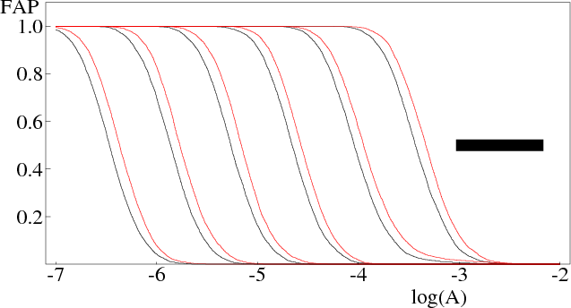 Figure 4: False-alarm probability that a structure appears in STFT (black) and CWD (grey) due to observational noise. The amplitude of the added Gaussian noise ( from left to right) are 0.0025, 0.005, 0.01, 0.02, 0.04, and 0.08. The black rectangle represents the amplitudes of the visible real structures in Fig. 3. |