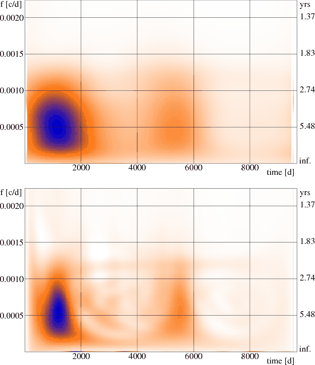 and 4000 days at low frequencies. These are well-defined signatures of structures with two different frequencies, even short-lived ones, and their appearance remains mostly invariant against changes in the preprocessing (e.g. smoothing). STFT with our test data clearly displays the same double frequency structure, however, according to our experience, PWD is superior in some cases to STFT in this property.