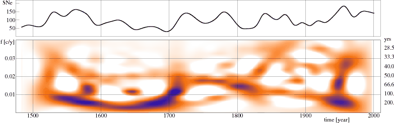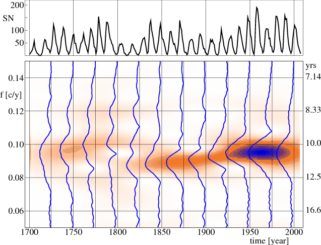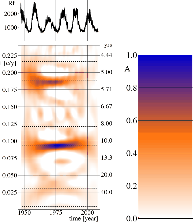 Figure 1: Short-term Fourier transform ( bottom) of the sunspot number time series ( top). Fourier-transforms of the subsets of the dataset are also plotted. The colour scale of relative variations in the distributions is presented in Fig. 7. |
