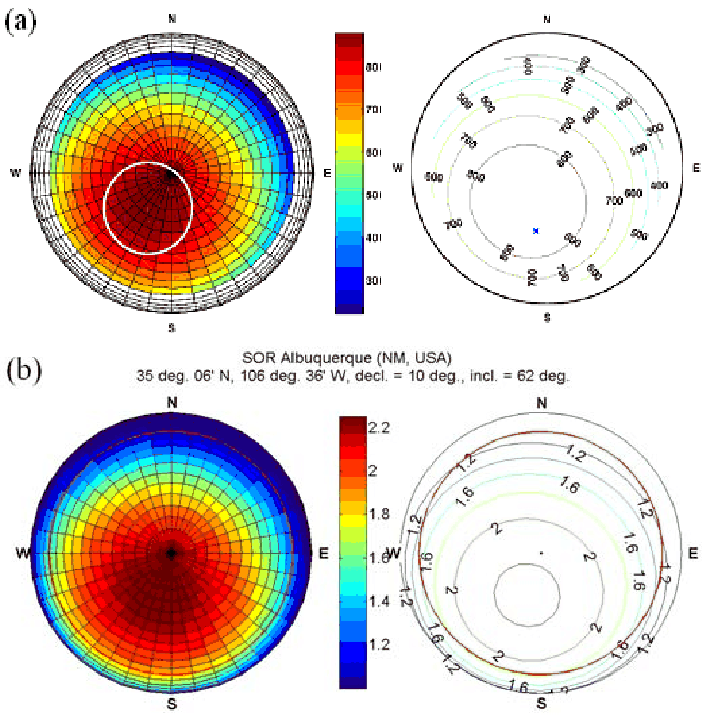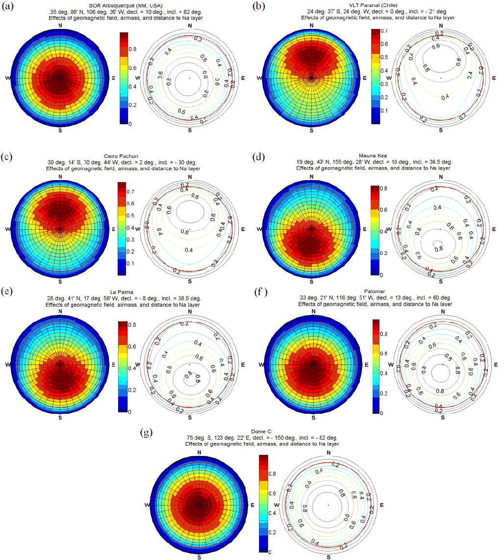 Figure 10b represents the relative sodium return enhancement of optical pumping with a circularly polarized laser beam in the presence of the geomagnetic field. The red circle indicates the observation limit of the telescope (60