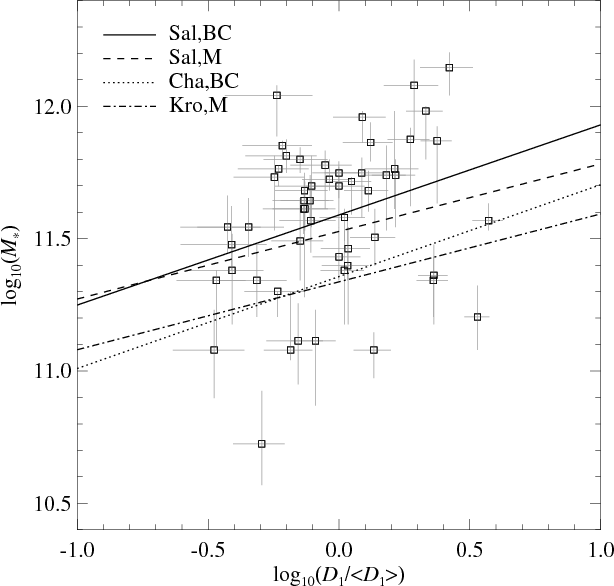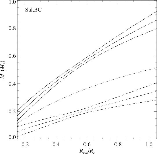 Figure 2: Histograms of the best-fit values of the photometric mass derived by comparing the observed SEDs of the 57 early-type grade-A lens galaxies of the SLACS survey with different composite stellar-population models (Bruzual & Charlot (BC) and Maraston (M)) and IMFs (Salpeter (Sal), Chabrier (Cha), Kroupa (Kro)). |