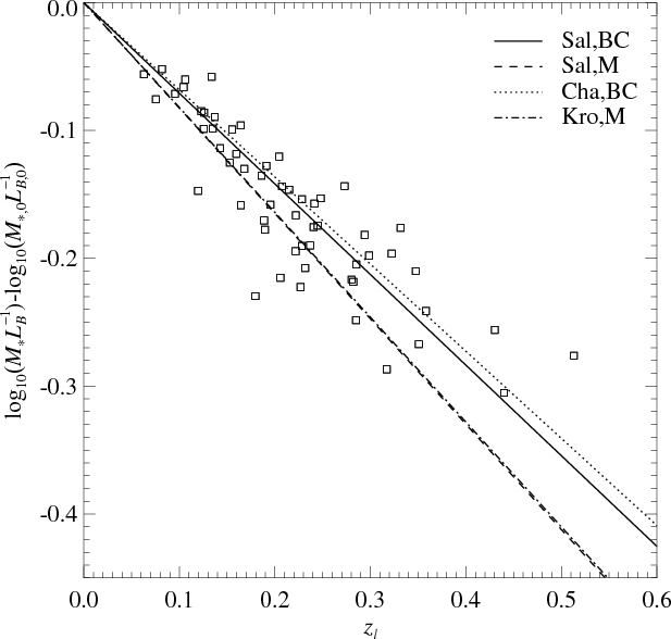 - For the lenses, the evolutionary rate value of the rest-frame B-band stellar mass-to-light ratio is consistent, within the uncertainties, with that obtained from the FP on the effective mass-to-light ratio. This offers some more evidence of the linear relation between the lens total and photometric masses.