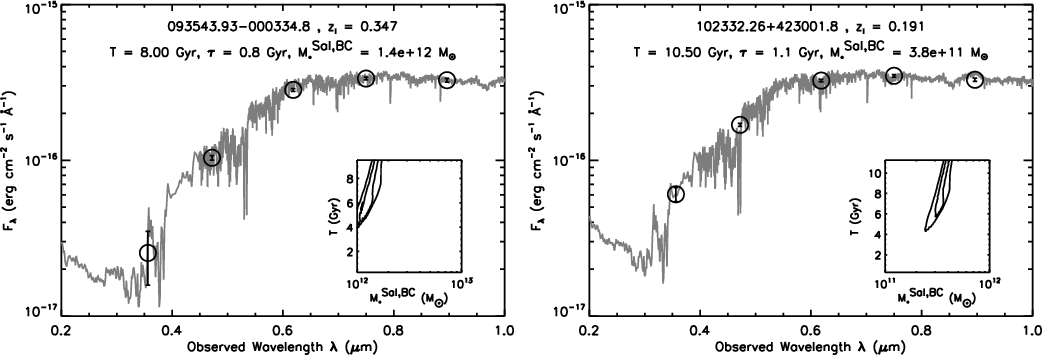 SEDs and best-fit models of the two lens galaxies SDSS J0935-0003 ( left) and SDSS J1023+4230 ( right). The observed total flux densities and their 1 |