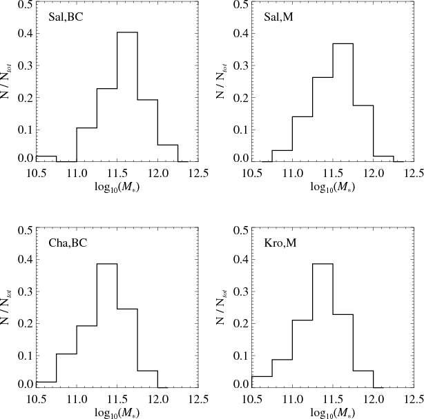To compute our composite stellar-population models, we choose Bruzual & Charlot (2003, indexed BC) and Maraston (2005, indexed M) dust-free templates at solar metallicity. We adopt a Salpeter (1955, indexed Sal) and a Chabrier (2003, indexed Cha) IMF for Bruzual & Charlot models and a Salpeter and a Kroupa (2001, indexed Kro) IMF for Maraston models. These IMFs differ significantly only for stars less massive than 1 .