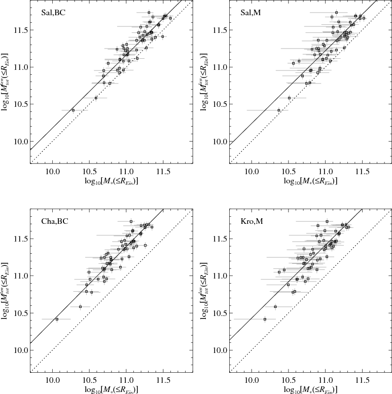- Inside the Einstein radii of the lensing systems, the values of the total projected mass measured from the lens models are linearly proportional to the values of the luminous mass estimated from the SED fits.