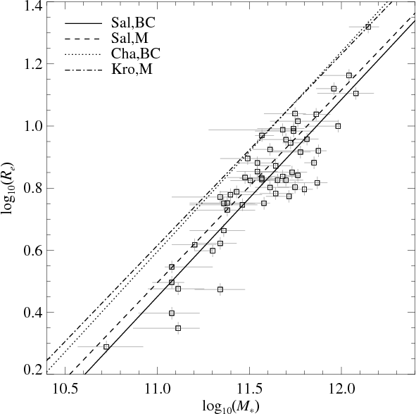 in a sample of more than 105 galaxies in the SDSS. In that study, the values of the photometric mass were based on Bruzual & Charlot models and a Kroupa IMF. The scaling laws presented in Eqs. (4) and (5) have been shown to have important implications for the formation and evolution of early-type galaxies in all hierarchical merging models (see Shen et al. 2003; McIntosh et al. 2005; Rettura et al. 2008; van der Wel et al. 2008; Cimatti et al. 2008).