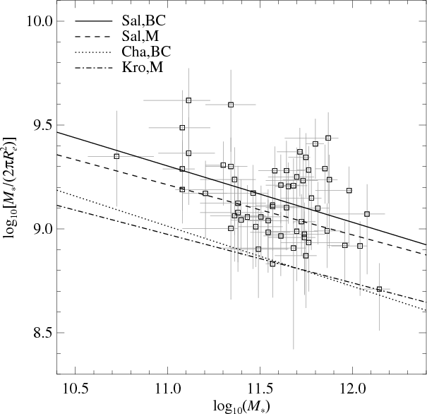 and surface stellar mass density-stellar mass