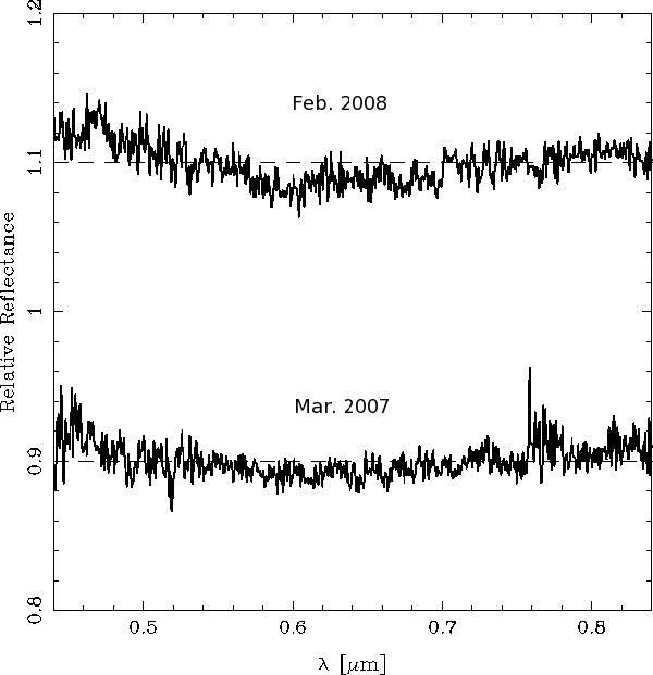 For both runs, data reduction was performed using standard Midas and IRAF procedures (see Fornasier et al. 2004). We computed the slope of the resulting spectra using a standard least squares fitting of a linear function, in the wavelength range between 0.5 and 0.8