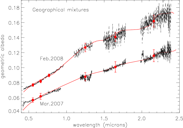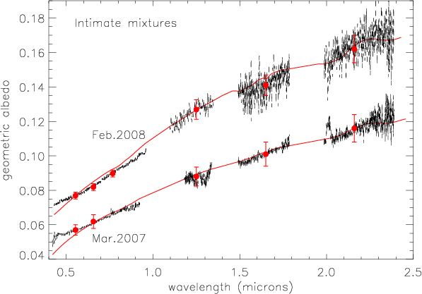 Model 1. We first used an intimate mixture of all compounds mentioned in Sect. 3.1. The spectrum taken in March 2007 were modeled by a mixture of 3% of crystalline water ice (10 m grains), 5% of amorphous water ice (10