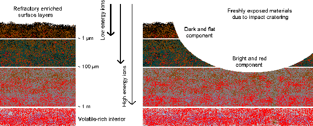 Figure 7: Interpretation of Chariklo's spectral behaviour in terms of space weathering processes and impacts. |