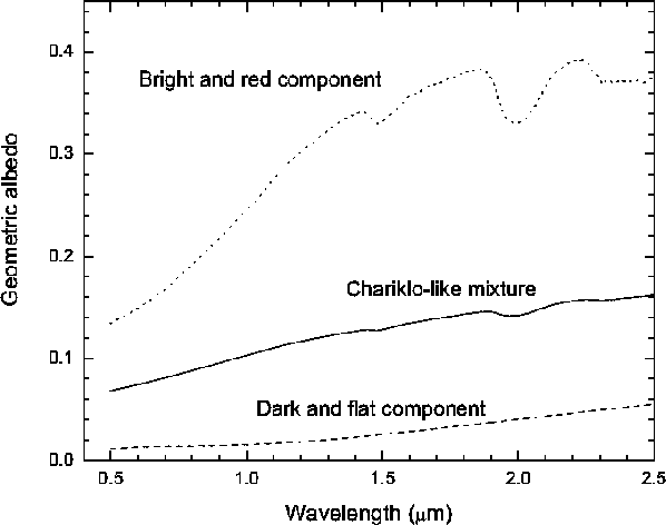 Ices. Water ice bands were identified in Chariklo's NIR spectrum (Dotto et al. 2003; Brown et al. 1998; Brown & Koresko 1998), so water should be and was included in the model. Other ices might be present on Chariklo's surface, but no clear NIR absorption features were identified in its spectrum. This would suggest that their abundance on the surface is well below 10% (see discussion on minor components in Pinilla-Alonso et al. 2009), so we did not introduce any other volatile compounds in our modeling. We added both crystalline and amorphous water ice (optical constants from Grundy & Schmitt 1998 for crystalline water ice at 40 K, and from Schmitt et al. 1998 for amorphous water ice at 38 K).
