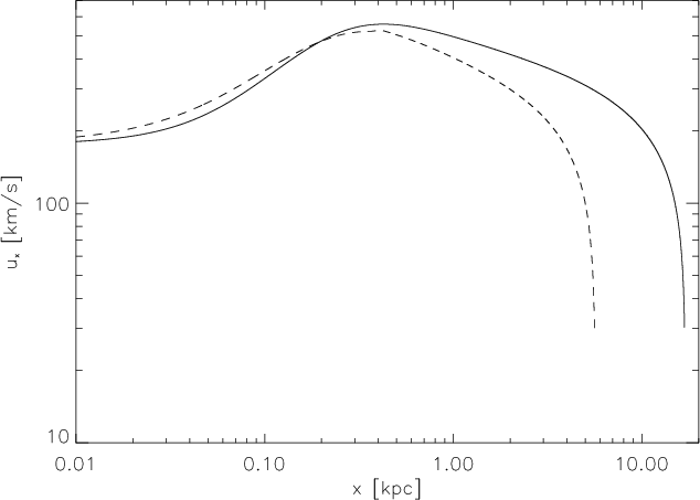 Inn our work, we have also assumed that the cluster producing the nozzle flow is located close to the Galactic centre. It would be interesting to study off-centre cluster winds, which should produce nozzle flows with curved paths, because HVC's could indeed be formed by massive clusters at some distance from the Galactic centre (see above).