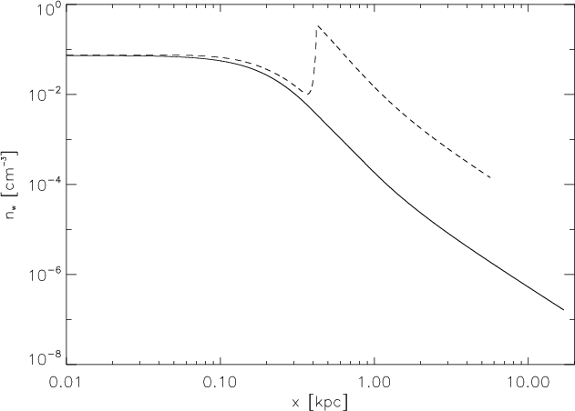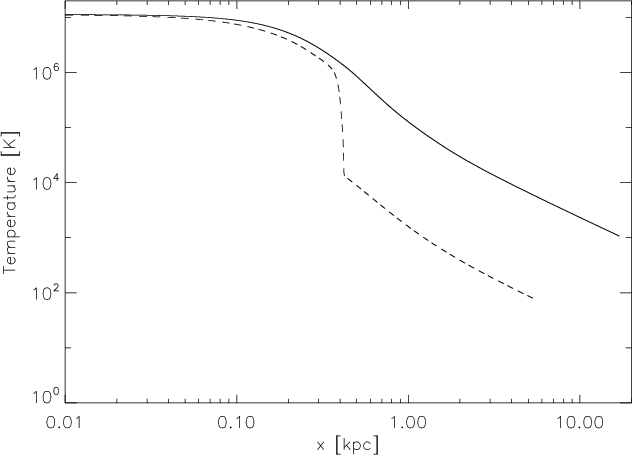 The paper is organized as follows. In Sect. 2, we describe the equations for a radiative nozzle flow, and in Sect. 3 we discuss the analytic solution obtained in the adiabatic case. In Sect. 4, we describe the Galactic potential and hot gas distribution, which are used in Sect. 5 to compute numerical integrations of the radiative nozzle flow equations. Finally, in Sect. 6 we discuss the application to these models for low and high velocity HI cloud formation, and we present our conclusions in Sect. 7.